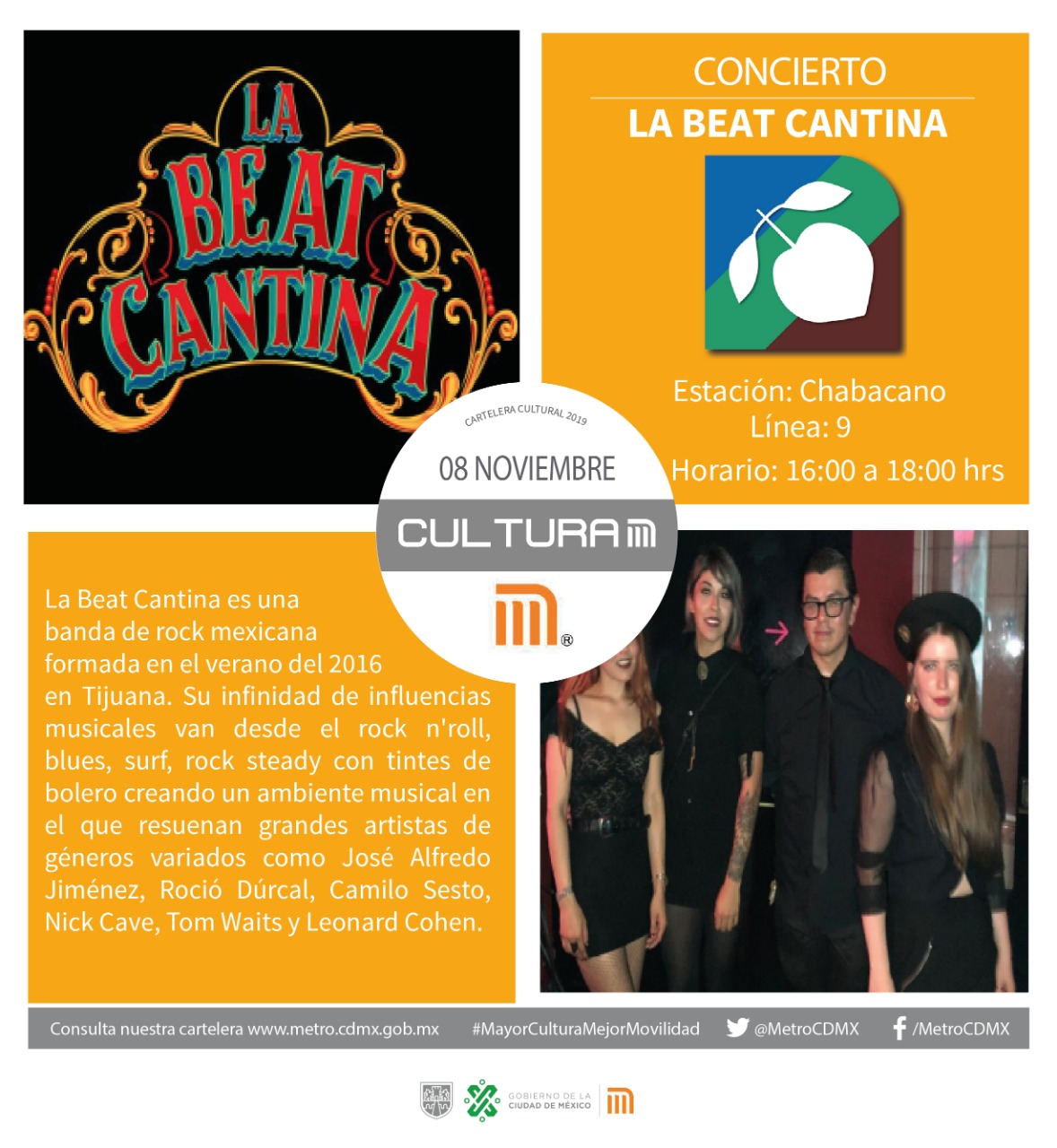 Si lo que quieres es bailar, la banda de rock mexicana, Beat Cantina, te hará sacar tus mejores pasos de baile a las 16:00 horas en la estación Chabacano de la Línea 9.