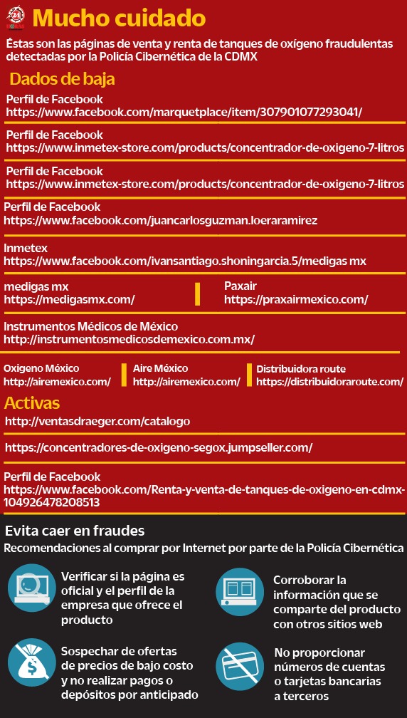 La Secretaría de Seguridad Ciudadana (SSC) de la Ciudad de México, a través de la Policía Cibernética, ha detectado al menos 12 sitios web fraudulentos que ofertaban rentas o ventas de paquetes de tanques de oxígeno, aprovechando la necesidad de la gente por la pandemia de Covid-19; 10 de ellos ya fueron desactivados.