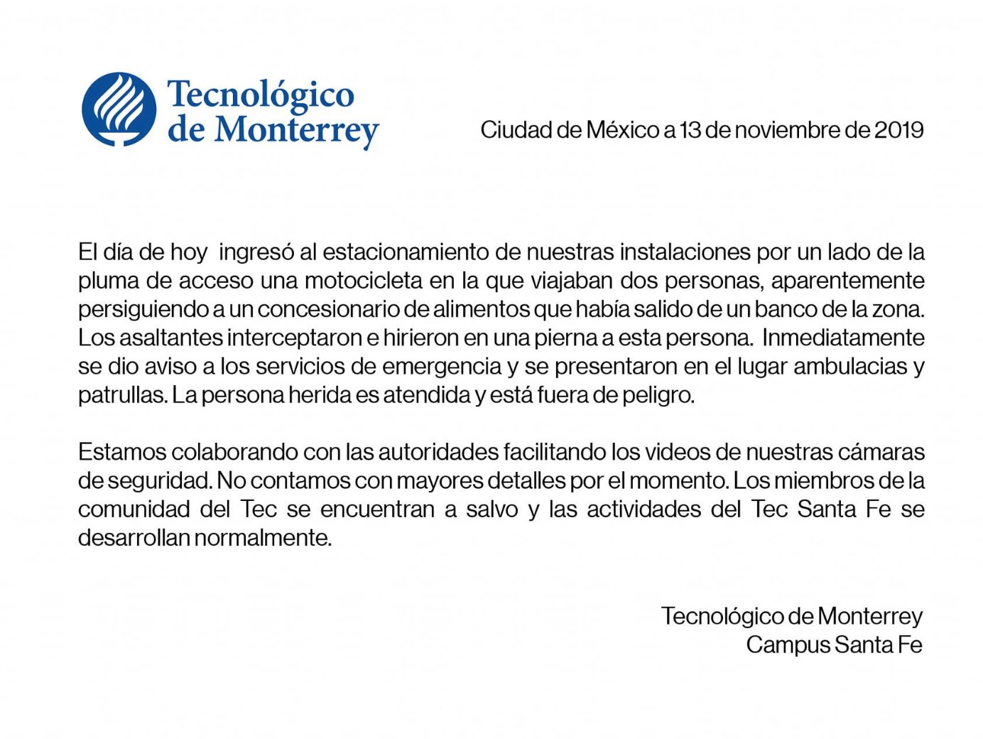 Por su parte el Tecnológico de Monterrey, informó que dos sujetos irrumpieron en sus instalaciones a bordo de una motocicleta luego de seguir a un concesionario de alimentos.