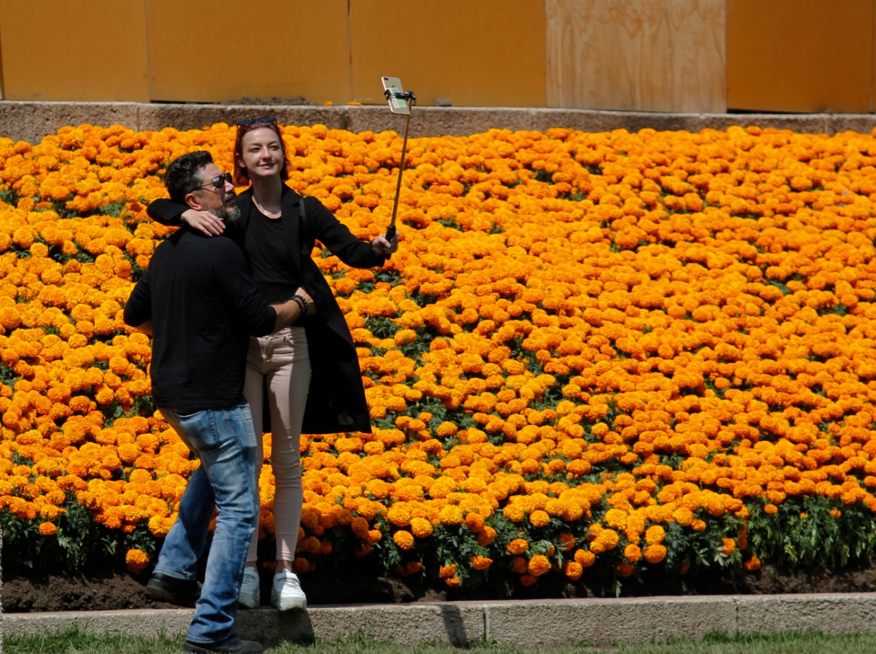 El camellón de Paseo de la Reforma se vistió de amarillo-naranja, color de la flor de cempasúchil que, de acuerdo con la tradición mesoamericana, sus pétalos rociados en el camino guían a los difuntos que vienen a la Tierra a visitar a los parientes a disfrutar de los alimentos y bebidas que sus deudos les preparan porque son los que más les gustaban.