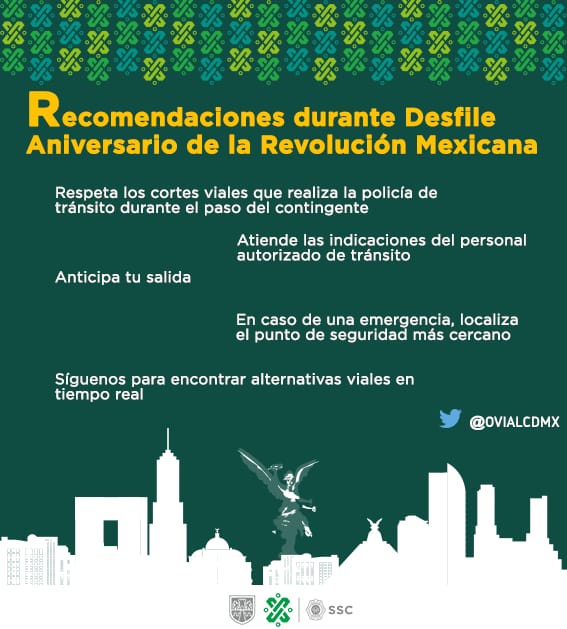 En un comunicado, la dependencia informó que desde las 06:00 horas del miércoles 20 de noviembre del 2019 y hasta el término de las actividades, la SSC implementarán dispositivos de vigilancia, seguridad y regulación de tránsito vehicular durante el recorrido del desfile, además se realizarán las acciones preventivas necesarias para evitar la comisión de ilícitos.