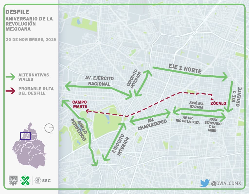 Esta Secretaría invita a los automovilistas a respetar los cortes viales y evitar circular durante la mañana, por 20 de Noviembre, Pino Suárez, José María Izazaga, 5 de Febrero, Moneda, así como de Avenida Circunvalación a Plaza de la Constitución, Francisco I. Madero y Seminario y atender las siguientes alternativas: