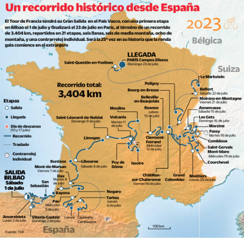 Los 176 corredores de esta 110ª edición iniciarán el sábado a las 10h30 GMT delante del estadio de San Mamés, una de las primeras etapas más difíciles de la historia del Tour de Francia. Un trazado que llevará al pelotón de vuelta a Bilbao tras recorrer 185 km a través del territorio vizcaíno, plagado de pequeñas alturas.
