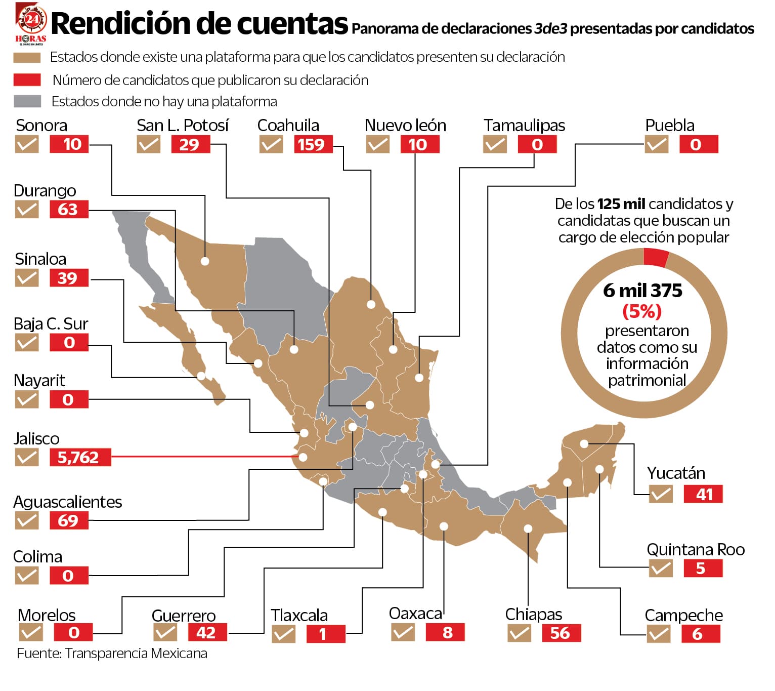 La tendencia a la opacidad es generalizada entre los aspirantes a puestos de elección popular, ya que de los 125 mil candidatos y candidatas que buscan un cargo en el país, sólo 6 mil 375, es decir el 5% ,han presentado datos como su información patrimonial, declaración de pago de impuestos y de intereses, según la organización.
