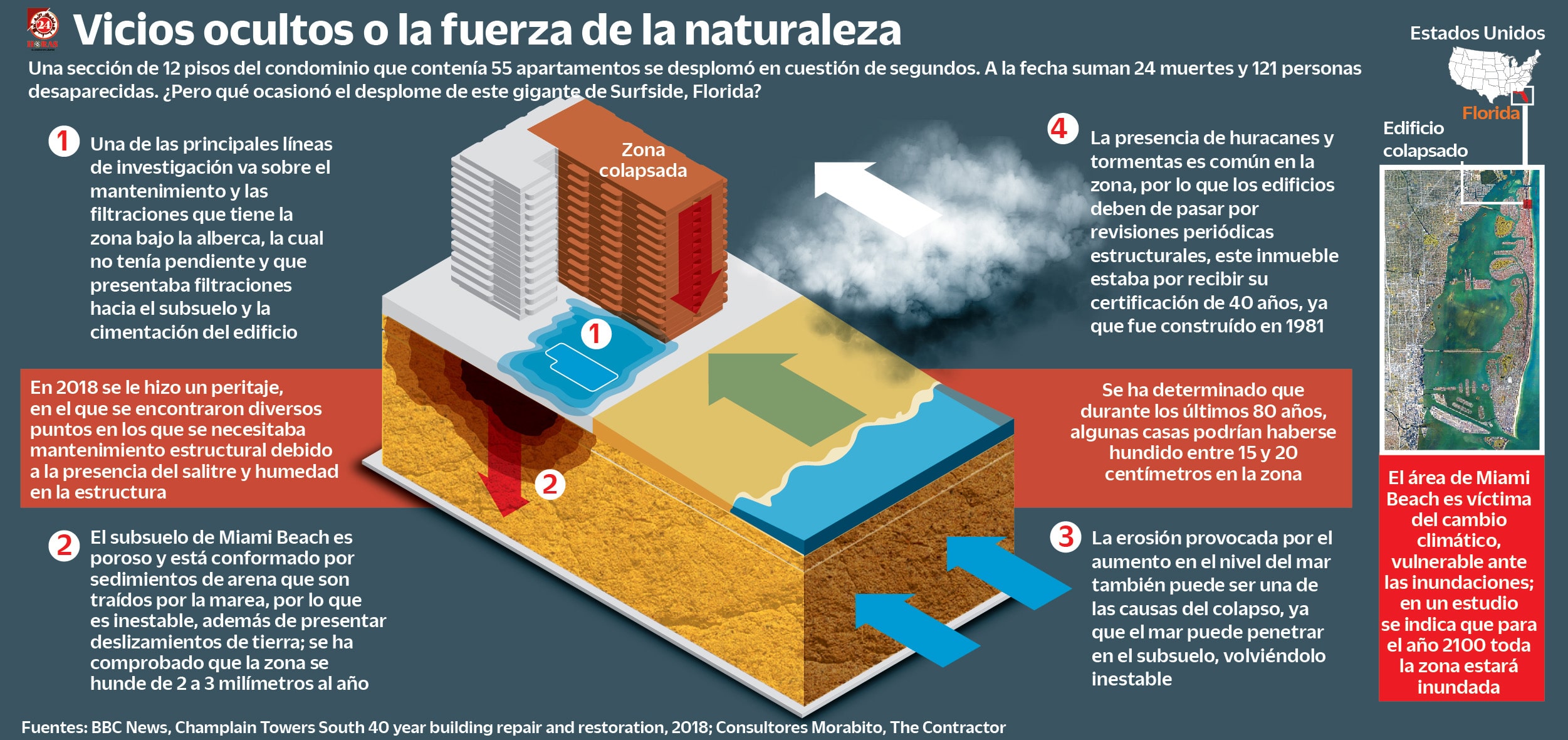 Entre las hipótesis están la antigüedad del edificio (40 años), la porosidad del terreno donde fue construido, el deterioro de los cimientos por el agua salina y las fallas de diseño y daños estructurales mencionados en un informe de 2018.
