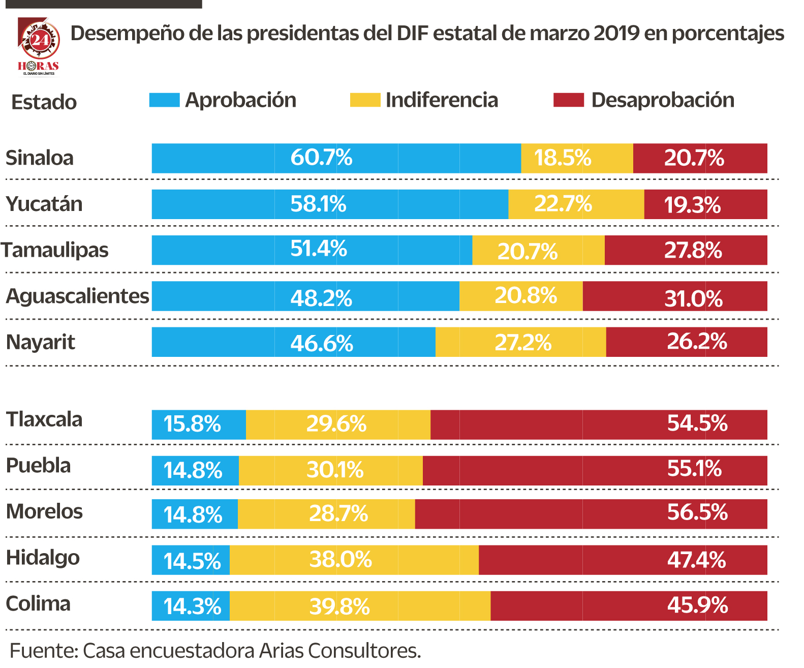 La casa encuestadora Arias Consultores informó que, en paralelo a las evaluaciones realizadas a los gobernadores, llevaron a cabo la evaluación de la percepción del desempeño de las presidentas estatales del DIF por parte de sus ciudadanos, donde Sinaloa ocupó el primer sitio. A partir de una encuesta aplicada a través de redes sociales a siete mil 644 personas del 22 al 24 de marzo pasado, la percepción de la aprobación del desempeño de las presidentas del DIF a nivel nacional sigue siendo bajo. De esta forma, la presidenta del DIF de Sinaloa, Rosy Fuente de Ordaz, ocupó el primer lugar con 60.7% de aprobación.