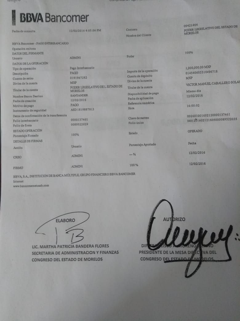 Mientras que Alberto Mojica recibió un millón 500 mil pesos el 27 de noviembre de 2015, a las 16:20 horas; Norma Alicia Popoca Sotelo recibió 750 mil pesos el 27 de noviembre de 2015, de dicha cuenta del Congreso a una cuenta personal en Banamex, a las 17:02 horas; Jaime Álvarez, diputado de Movimiento Ciudadano recibió un monto total de 6 millones de pesos.