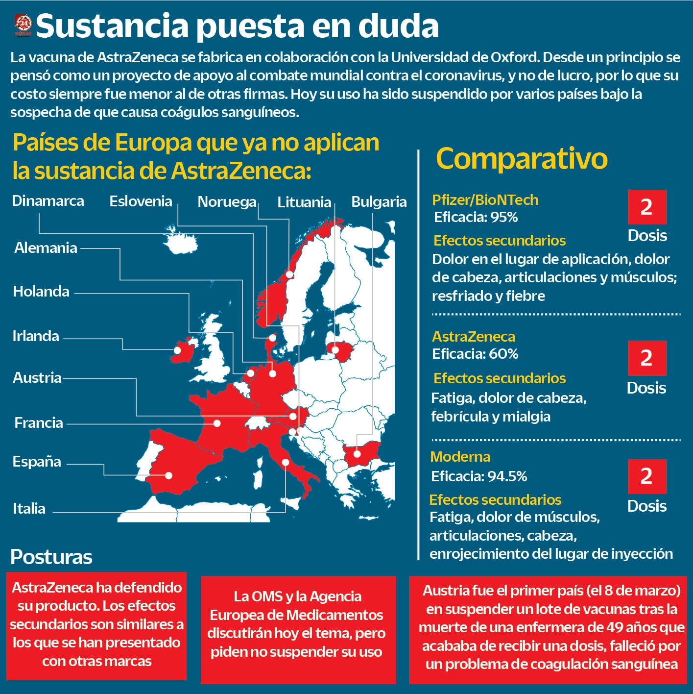 Más países comenzaron a imitar a Austria e interrumpieron el uso de la sustancia desarrollada por el laboratorio inglés/sueco que trabaja en conjunto con la Universidad de Oxford, detonando alarma mundial y provocando la reacción de los reguladores sanitarios del mundo. De hecho, la Organización Mundial de la Salud (OMS) y la Agencia Europea de Medicamentos (EMA) sostendrán hoy una reunión para tratar el tema.