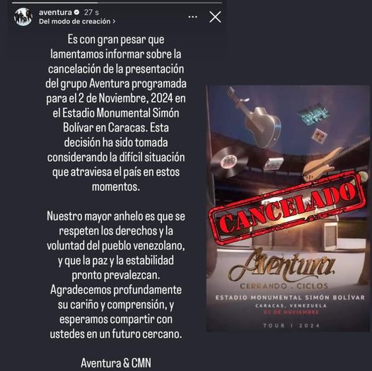 "Con gran pesar lamentamos informar sobre la cancelación de la presentación del grupo Aventura programada para el 2 de noviembre, en el Estadio Monumental Simón Bolívar en Carcas. Está decisión ha sido tomada considerando la difícil situación que atraviesa el país en estos momentos.