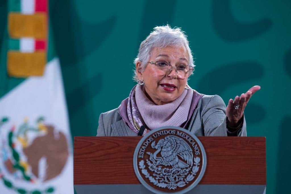 Durante este miércoles, Sánchez Cordero estuvo acompañada de cinco funcionarias más. Todas arribaron con el cubrebocas puesto, pero como lo ha hecho en sus dos conferencias anteriores, la secretaria se quitó el artículo para hacer uso del micrófono y lo colocó en una parte del atril.