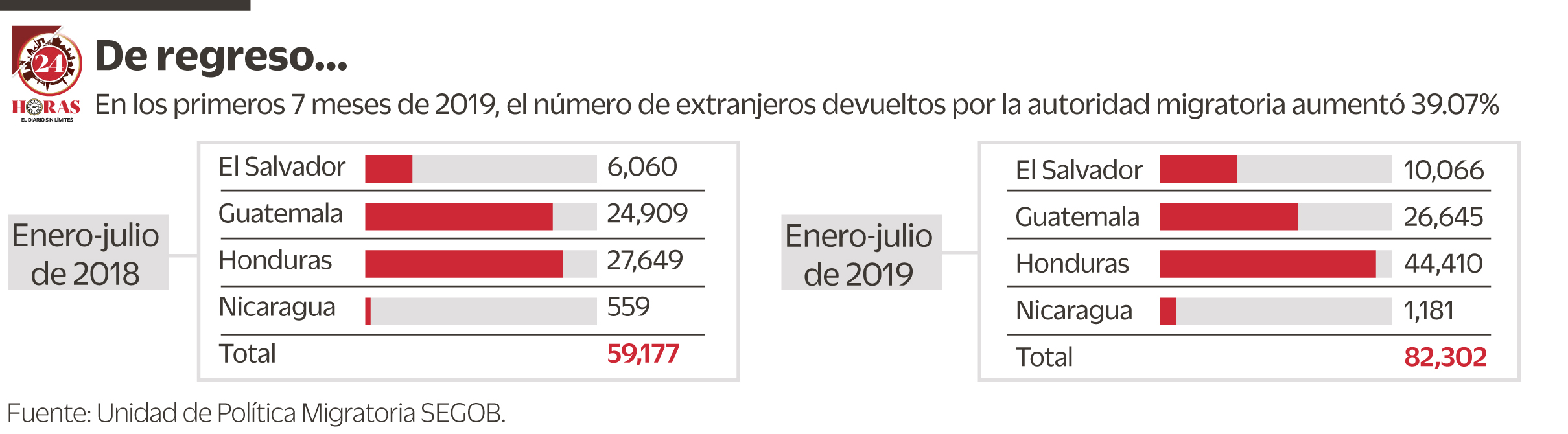 El número de centroamericanos devueltos a sus países de origen registró un aumento de 39.07%; en los sietes meses de este año devolvieron a 82 mil 302 contra el mismo período de 2018 que contabilizó 59 mil 177.