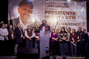 Andrés Manuel López Obrador, aspirante a la Presidencia de la República por la coalición Juntos haremos historia, acudió a un acto proselitista en Tijuana portando una chamarra con el nombre de Andresmanuelovich.