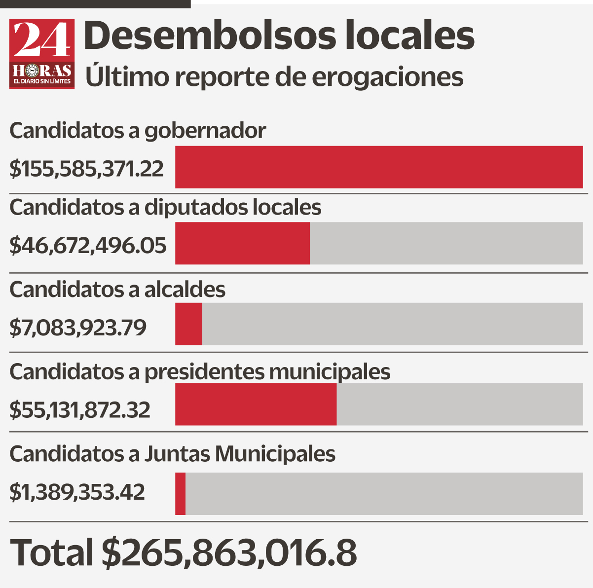 A 43 días de la jornada electoral, los candidatos a puestos de elección local, gobernador, legisladores y alcaldes, reportan un gasto de 265.8 millones de pesos. De acuerdo al Sistema de Fiscalización del Instituto Nacional Electoral (INE), los 43 candidatos a gobernador de nueve entidades, reportan erogaciones por 155.5 millones de pesos.