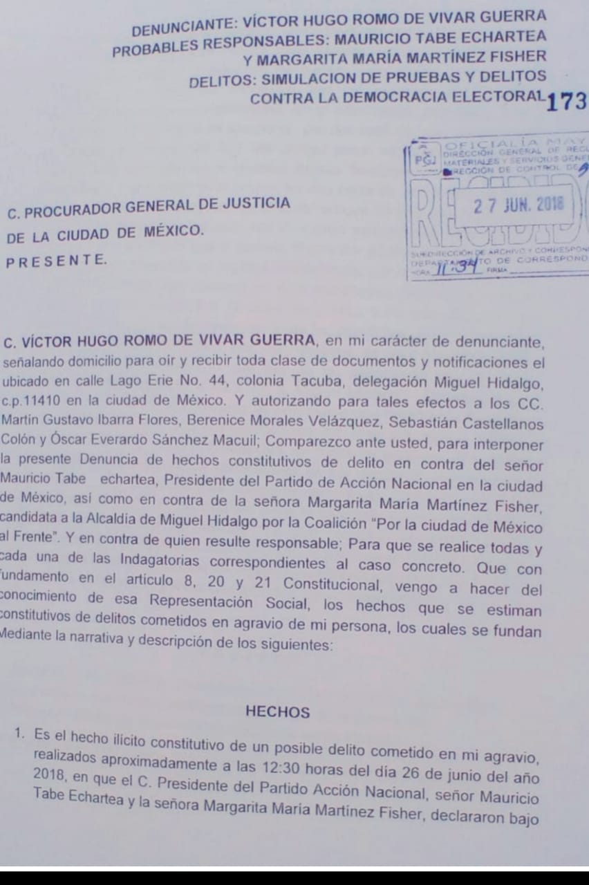 La denuncia es contra Mauricio Tabe Echartea, presidente del PAN capitalino y la candidata del PAN, PRD y MC a la alcaldía de Miguel Hidalgo, María Margarita Martínez Fisher, por emitir falsas declaraciones e incurrir en los delitos de simulación de pruebas y contra la democracia electoral.