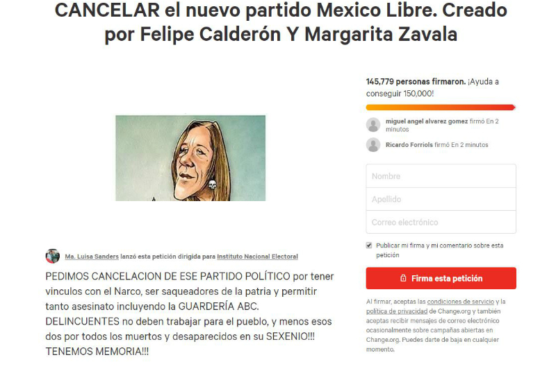 La petición en https://www.change.org/p/a-los-mexicanos-cancelar-el-nuevo-partido-mexico-libre-creado-por-felipe-calder%C3%B3n-y-margarita-zavala  ha tenido un impacto notable, pues llevan acumuladas casi 150 mil firmas.
