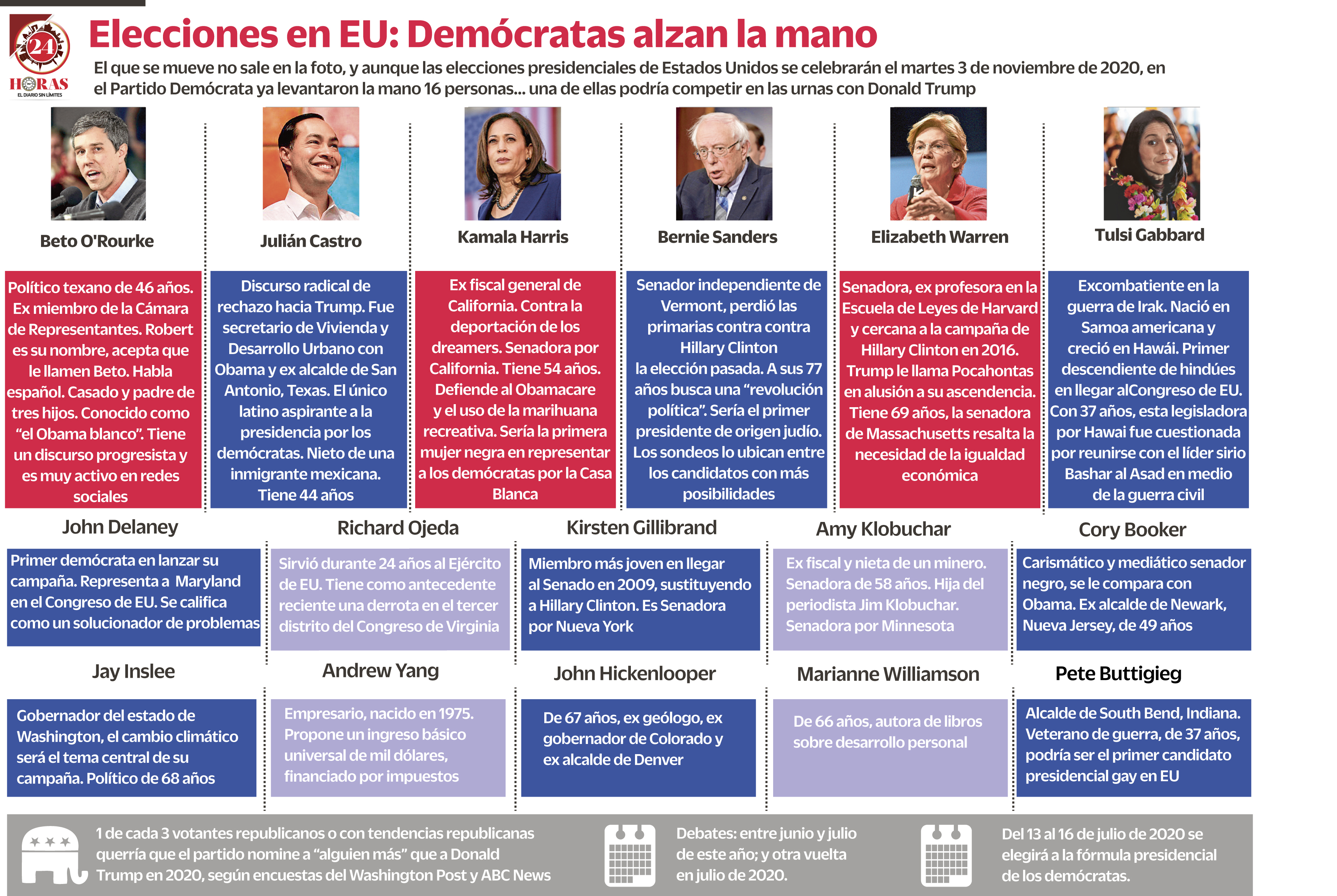 El que se mueve no sale en la foto, y aunque las elecciones presidenciales de Estados Unidos se celebrarán el martes 3 de noviembre de 2020, en el Partido Demócrata ya levantaron la mano 16 personas... una de ellas podría competir en las urnas con Donald Trump