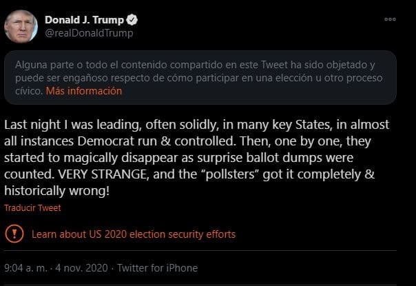 "Alguna parte o todo el contenido compartido en este Tweet ha sido objetado y puede ser engañoso respecto de cómo participar en una elección u otro proceso cívico", se lee.