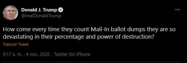 En otro mensaje en su cuenta de Twitter, el mandatario cuestionó los resultados arrojados por los votos por correo.