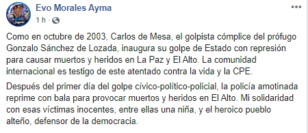 Después del primer día del golpe cívico-político-policial, la policía amotinada reprime con bala para provocar muertos y heridos en El Alto. Mi solidaridad con esas víctimas inocentes, entre ellas una niña, y el heroico pueblo alteño, defensor de la democracia.