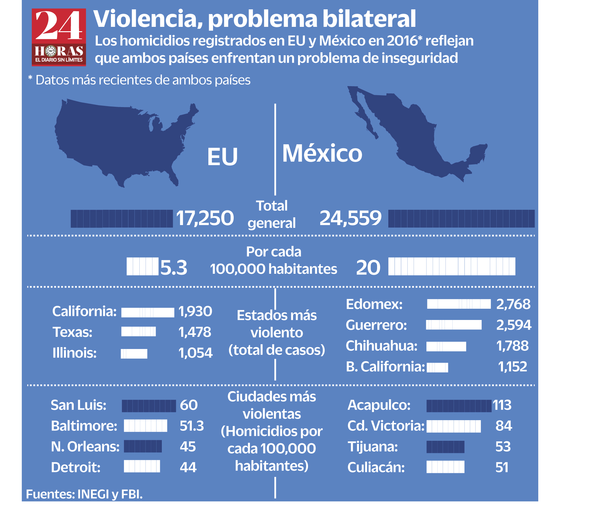 Ese mismo año se registraron en EU 17 mil 250 homicidios, 8.6% más que en 2015, de acuerdo con cifras del FBI, las cuales revelan que los estadounidenses enfrentan un aumento de la violencia, que ha prendido alertas por los crímenes con armas de fuego.