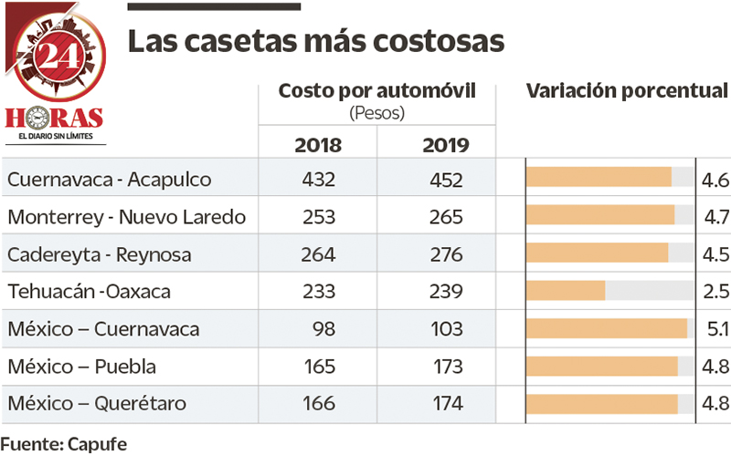 El tramo carretero más costoso este año, será el que va de Cuernavaca a Acapulco, que tendrá una tarifa para automóvil de 452 pesos, cifra que representa un aumento de 4.6% con respecto al año pasado, según datos de Capufe.