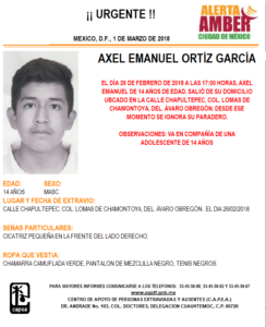 La Procuraduría General de Justicia capitalina activó la Alerta Amber para localizar a Axel Emanuel Ortiz García, de 14 años, de quien se desconoce su paradero desde las 17:00 horas del pasado 26 de febrero, cuando salió de su domicilio ubicado en la calle Chapultepec, colonia Lomas de Chamontoya, delegación Álvaro Obregón.
