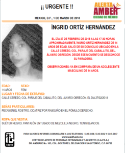 La Procuraduría General de Justicia capitalina activó la Alerta Amber para localizar a Ingrid Ortiz Hernández, de 14 años, de quien se desconoce su paradero desde las 17:30 horas del pasado 27 de febrero, cuando salió de su domicilio ubicado en la calle Cerezo, colonia Paraje del Caballito, delegación Álvaro Obregón.