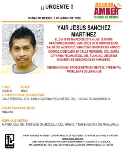 La Procuraduría General de Justicia capitalina activó la Alerta Amber para localizar a Yair Jesús Sánchez Martínez, de 15 años, de quien se desconoce su paradero desde las 13:00 horas del pasado 6 de marzo, cuando salió del albergue “Ama Como Quieras Ser Amado”, ubicado en la calle Pedregal, colonia Santa Catarina Yecahuitzol, .