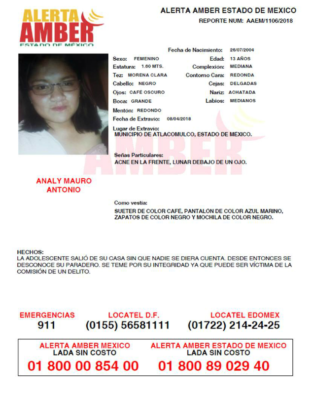 La Procuraduría General de Justicia de la Ciudad de México activó la Alerta Amber para localizar a Analy Maduro Antonio , de 13 años, de quien se desconoce su paradero desde el pasado 8 de abril, cuando se le vio por última vez en su domicilio ubicado municipio de Atlacomulco, Estado de México; del que salió sin que nadie se diera cuenta.