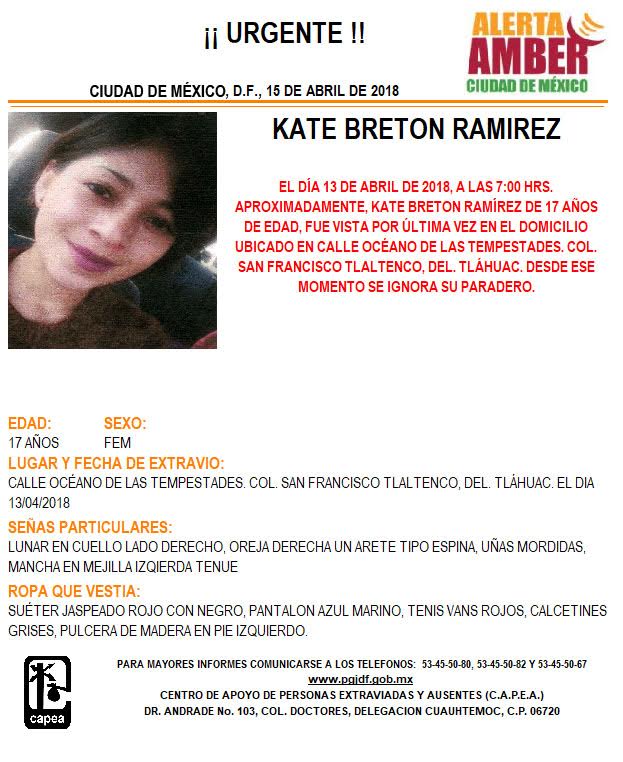 La Procuraduría General de Justicia de la Ciudad de México activó la Alerta Amber para localizar a Kate Breton Ramírez, de 17 años, de quien se desconoce su paradero desde las 07:00 horas del pasado 13 de abril, cuando fue vista por última vez en la calle Océano de las Tempestades, colonia San Francisco Tlaltenco, delegación Tláhuac.