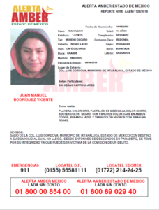 La Procuraduría General de Justicia de la Ciudad de México activó también la Alerta Amber para localizar a Juan Manuel Rodríguez Vicente, de 14 años, de quien se desconoce su paradero desde el pasado 6 de abril, cuando salió de la colonia Luis Cordova, municipio de Ixtapaluca, Estado de México; con destino a su domicilio, al cual no llegó.