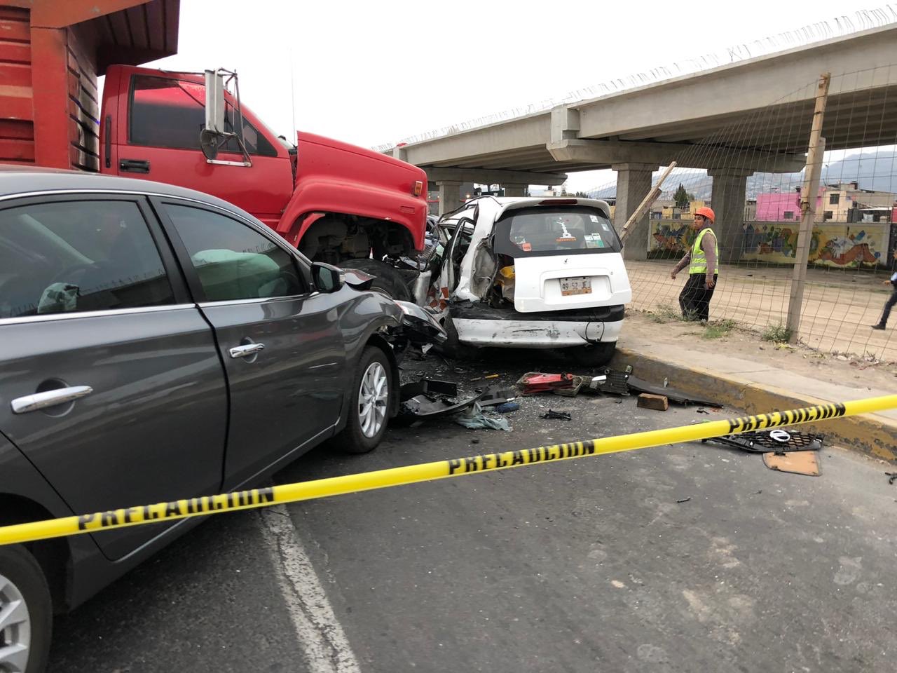 Un camión de carga embistió esta mañana a tres vehículos, dejando como saldo el mismo número de personas lesionadas y un muerto, en Ecatepec, enfrente de Plaza las Américas, Estado de México.