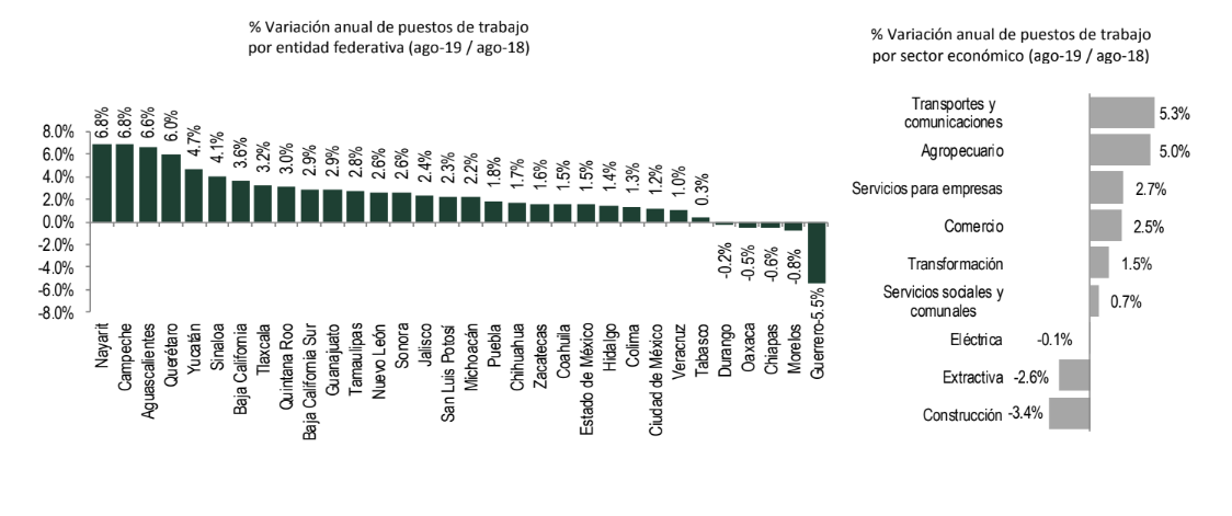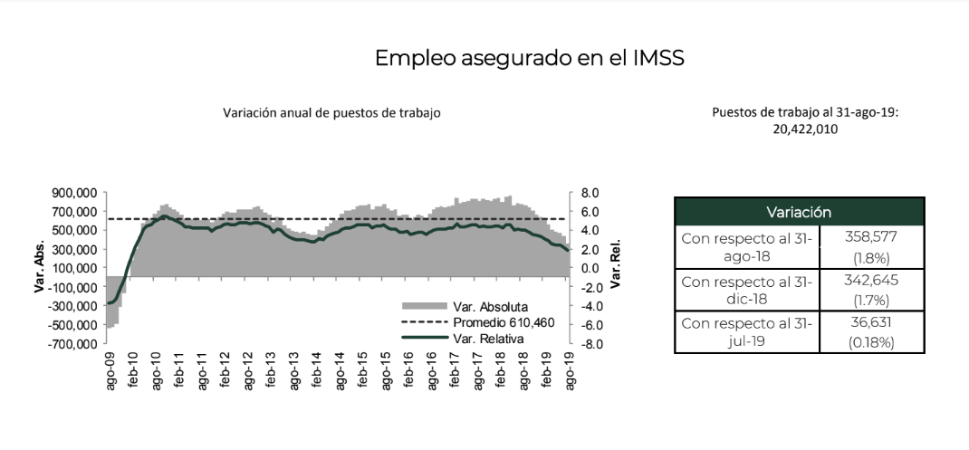 De esta manera, la variación del empleo en comparación a agosto de 2018 es de 358 mil 577 nuevos empleos, equivalente a una tasa anual de 1.8%.
