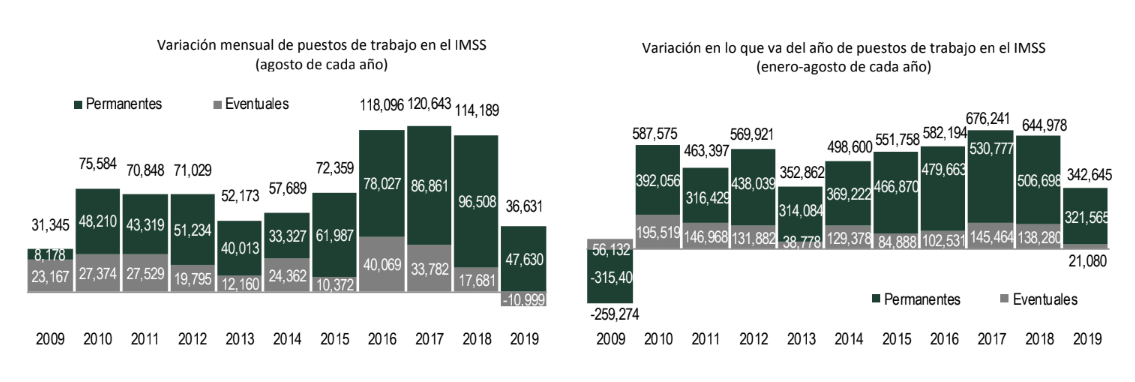 Al 31 de agosto de 2019, se tienen registrados ante el Instituto Mexicano del Seguro Social (IMSS) 20 millones 422 mil 010 puestos de trabajo; de éstos, el 85.9% son permanentes y el 14.1% eventuales. En los últimos años, estos porcentajes se han mantenido relativamente constantes.