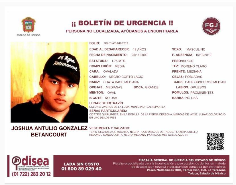 De acuerdo con la ficha emitida por la Fiscalía General de Justicia del Estado de México, Joshua Antulio González Betancourt, de 18 años de edad, se extravió el pasado 15 de octubre en la colonia Viveros de la Loma, en el municipio de Tlalnepantla.