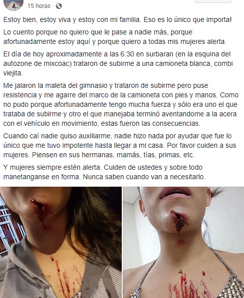 "Cuando caí nadie quiso auxiliarme, nadie hizo nada por ayudar que fue lo único que me tuvo impotente hasta llegar a mi casa. Por favor cuiden a sus mujeres. Piensen en sus hermanas, mamás, tías, primas, etc".