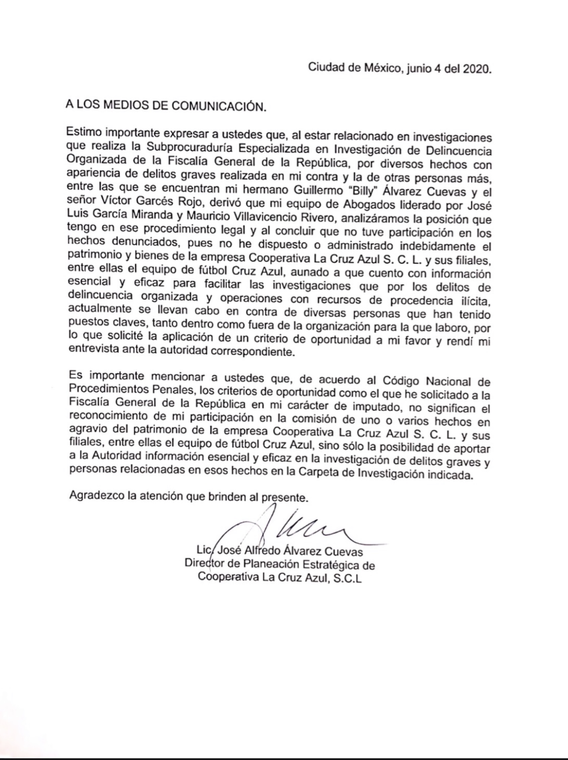 Con sus abogados analizó la posición que tiene en ese procedimiento legal y aseveró que “no he dispuesto o administrado indebidamente el patrimonio y bienes de la empresa Cooperativa La Cruz Azul S.C.L y sus filiales, entre ellas el equipo de futbol Cruz Azul".