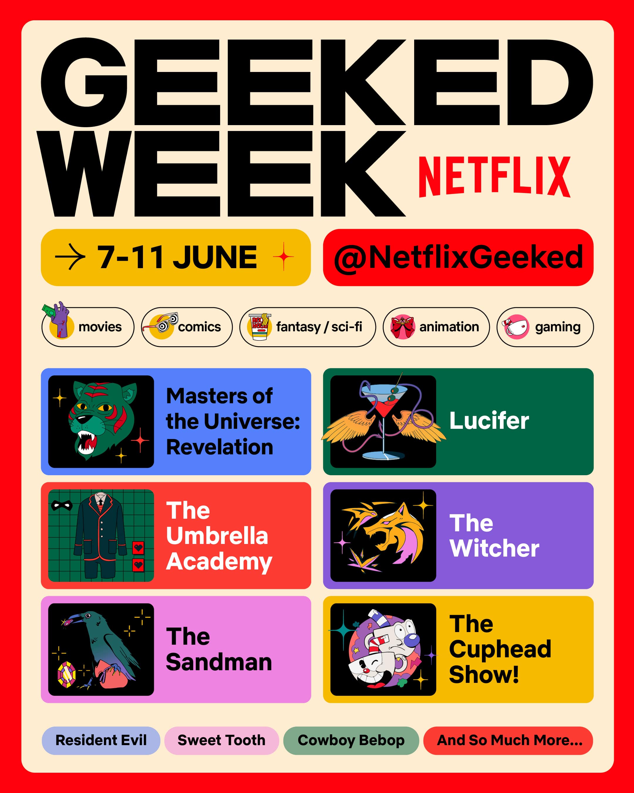 De acuerdo a lo publicado en sus redes, (@NetflixGeeked) habrá paneles y actividades relacionadas con series como The Umbrella Academy, The Witcher, Lucifer, Masters of the Universe: Revelation, y próximos estrenos como Resident Evil, Sweet Tooth y el live-action de Cowboy Bebop.