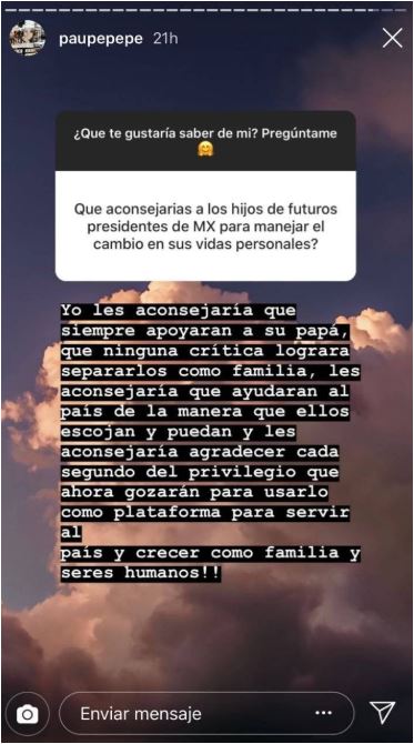 A través de la nueva función de Instagram, usuarios aprovecharon para preguntarle a la hija del actual mandatario cómo es la experiencia de tener un padre presidente y qué aconsejaría a los hijos de futuros presidentes de Mexico para manejar el cambio en sus vidas personales.