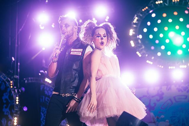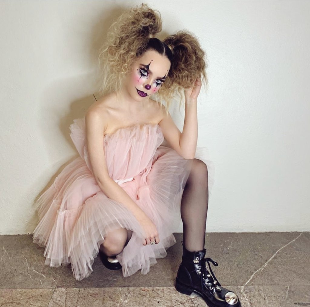 La también actriz compartió en su cuenta de Instagram el proceso al que se sometió tanto de maquillaje como de peinado para lucir como una auténtica payasita y estar ad doc con la agrupación, quienes suelen utilizar elemntos circenses.